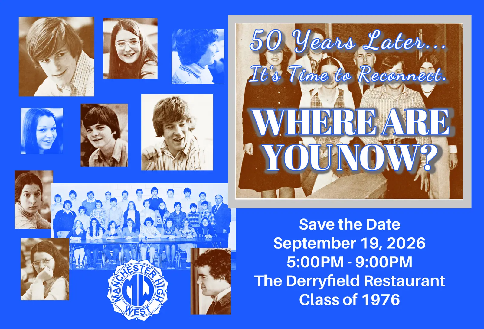 What: West High Class of 1976 Reunion When: September 19, 2026 Where:The Derryfield Restaurant Manchester, NH Time: 5:00PM – 9:00PM Who: All classmates + plus one welcome Cost: $TBD