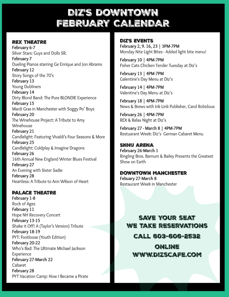 BE SURE TO MAKE YOUR RESERVATIONS SO WE CAN SAVE YOU A TABLE! WWW.DIZSCAFE.COM