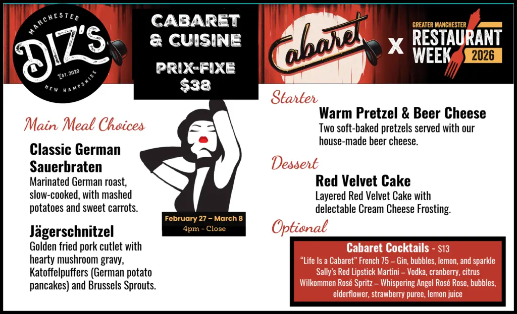 Restaurant Week is the perfect excuse to plan a full night out in Downtown Manchester. Catch Cabaret at The Palace Theatre, then stroll over to Diz’s for a German-inspired prix fixe supper — or dine first and head to the show feeling happily satisfied.