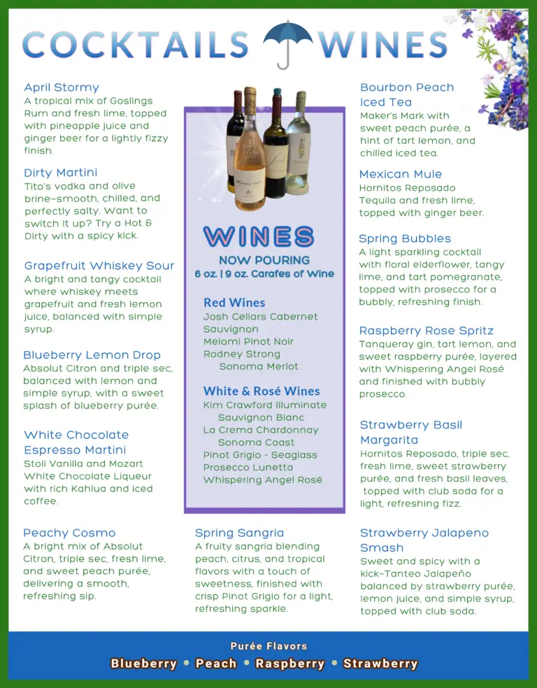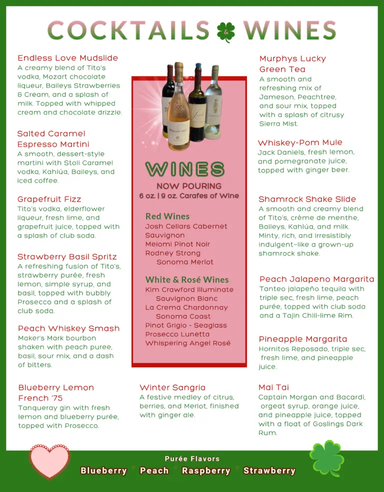 diz's signature drinks, wines & beer