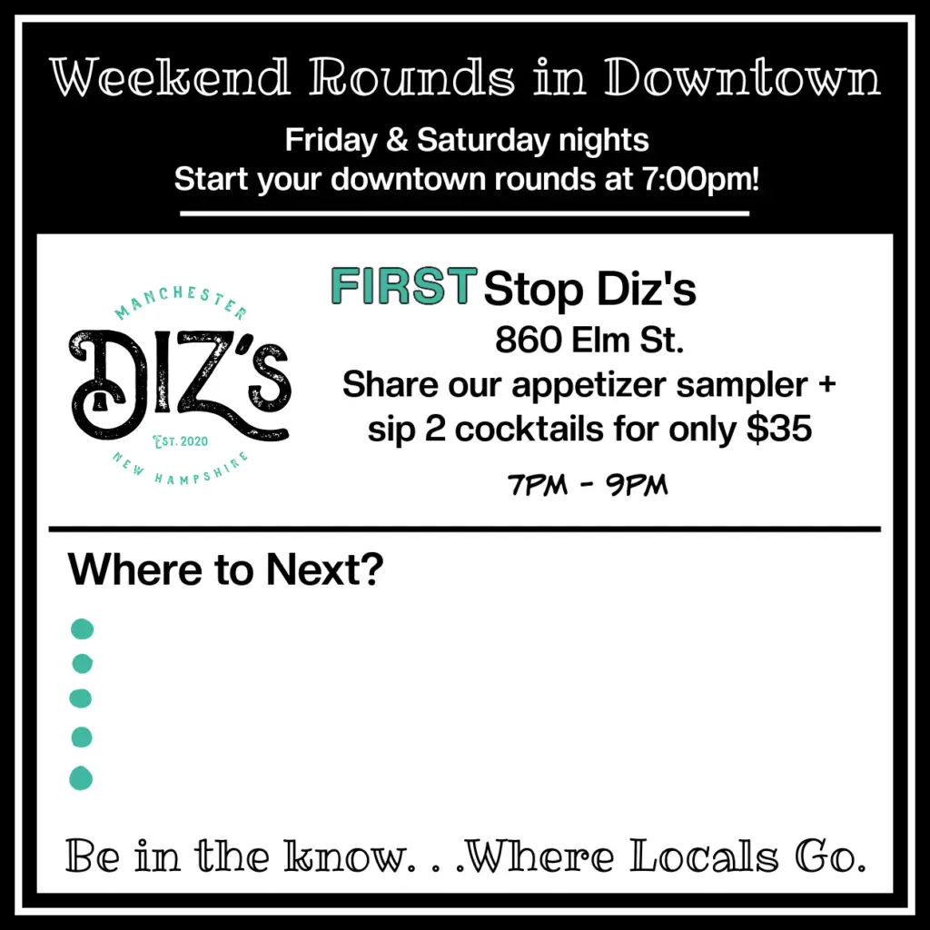 For Diz’s, this wave of restaurant-hopping fits perfectly with what we hear every day. Downtown residents and visitors want variety, comfort, and spaces where they can relax, sip, snack, or settle in for a full meal. And with so many awesome local restaurants just steps from each other, why not make your rounds-around Downtown? For ideas on making your rounds visit www.visitmanchesternh.com.
