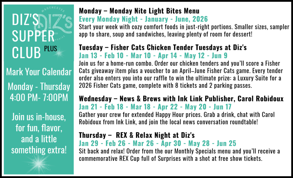 We know it’s easier to stay home when it’s cold outside — but this is New Hampshire. We bundle up, we show up, and we support our community. And when you do head out, Diz’s is right here for you at 860 Elm Street – steps from City Hall and The Bookery, in the heart of downtown Manchester.