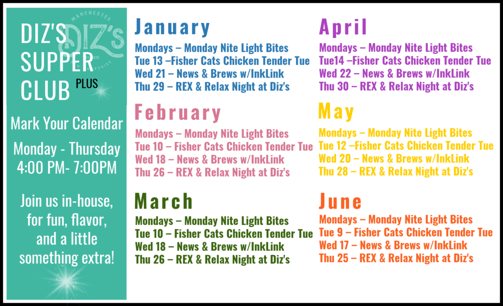 January and February in New Hampshire can feel long, cold, and quiet — but downtown Manchester doesn’t have to be. This is the time of year when local restaurants, downtown neighbors, and small businesses matter most to each other. If you live or work downtown, we’re inviting you to come out, warm up, and make Diz’s part of your weekly routine.
